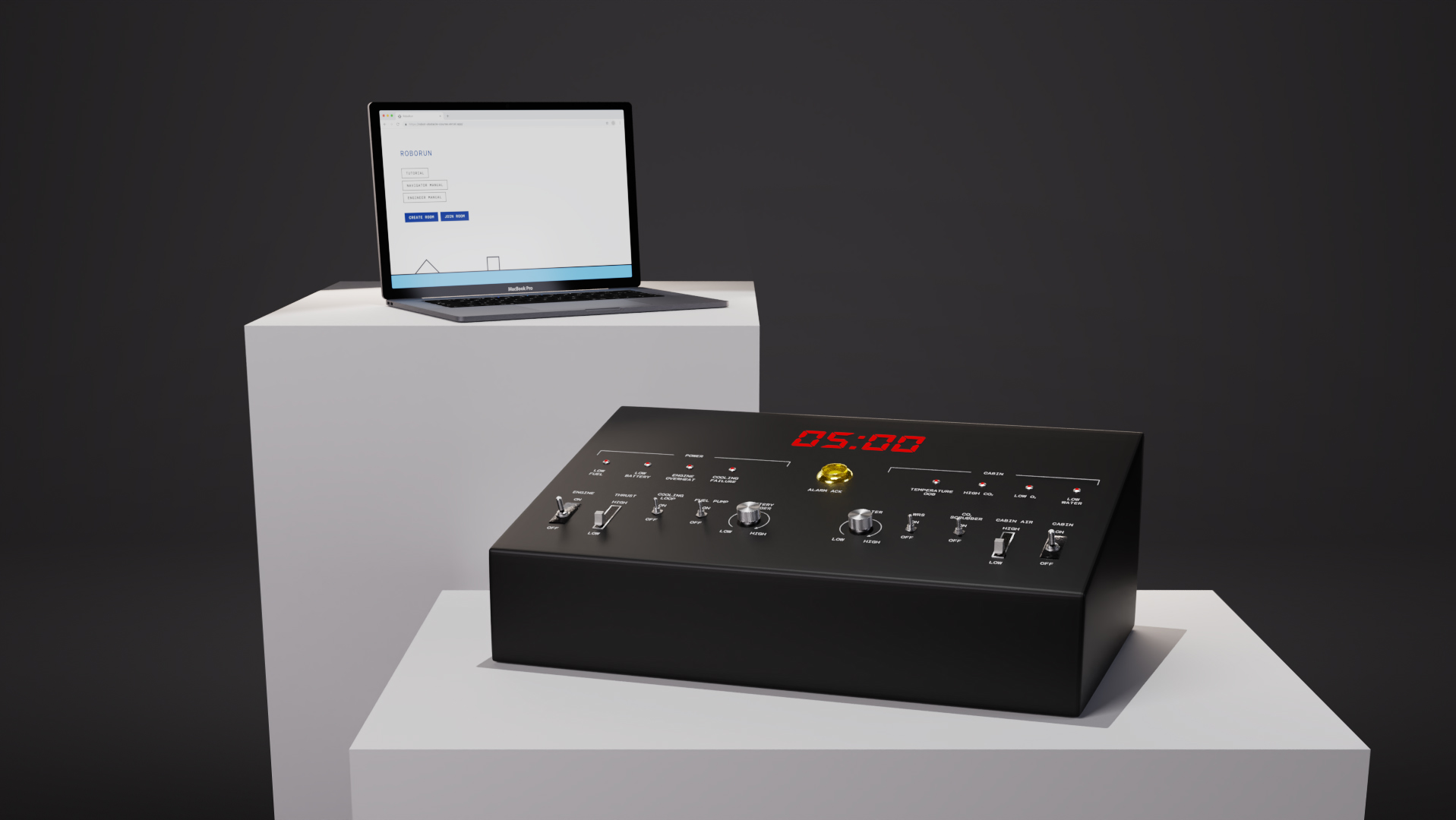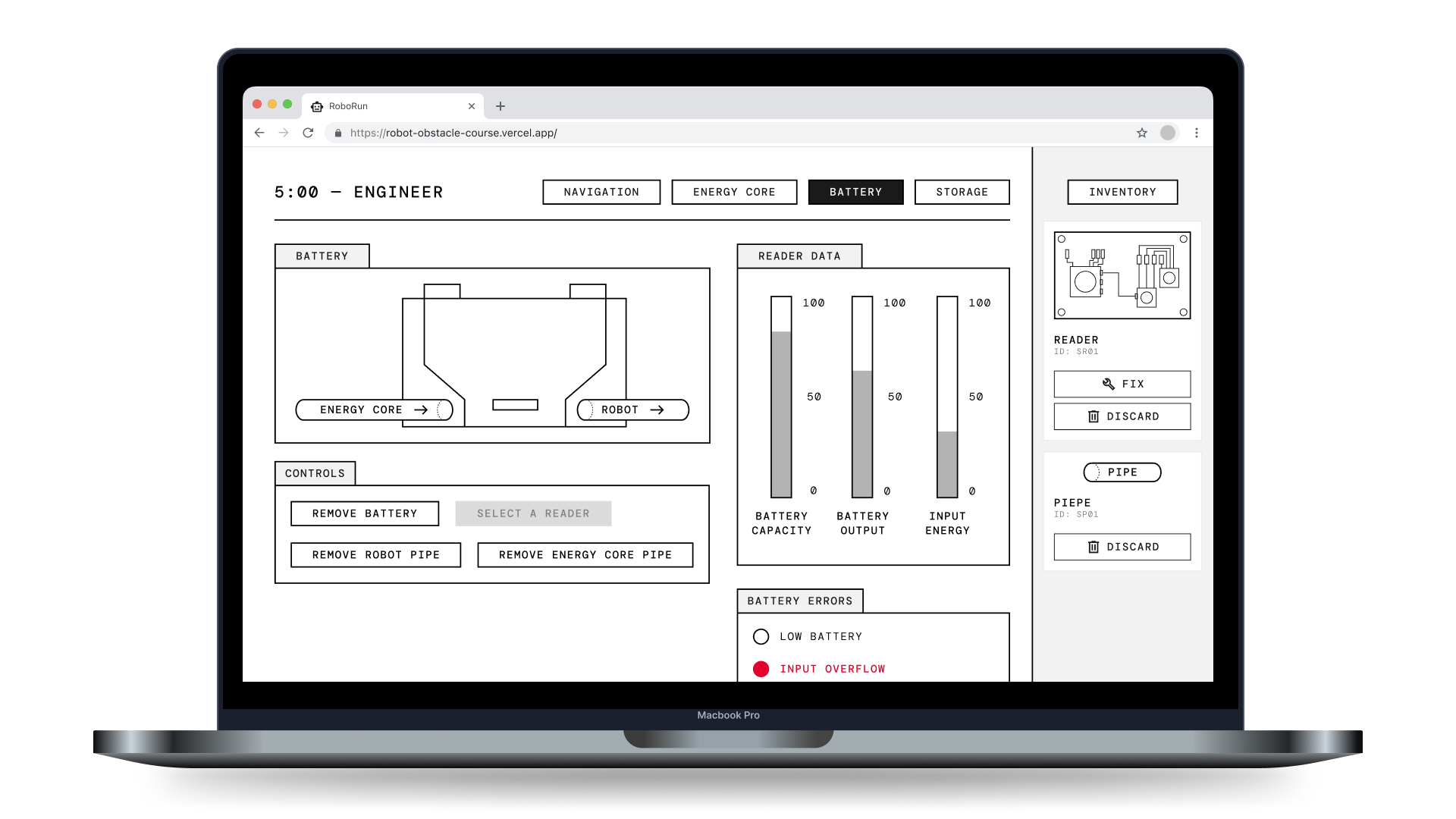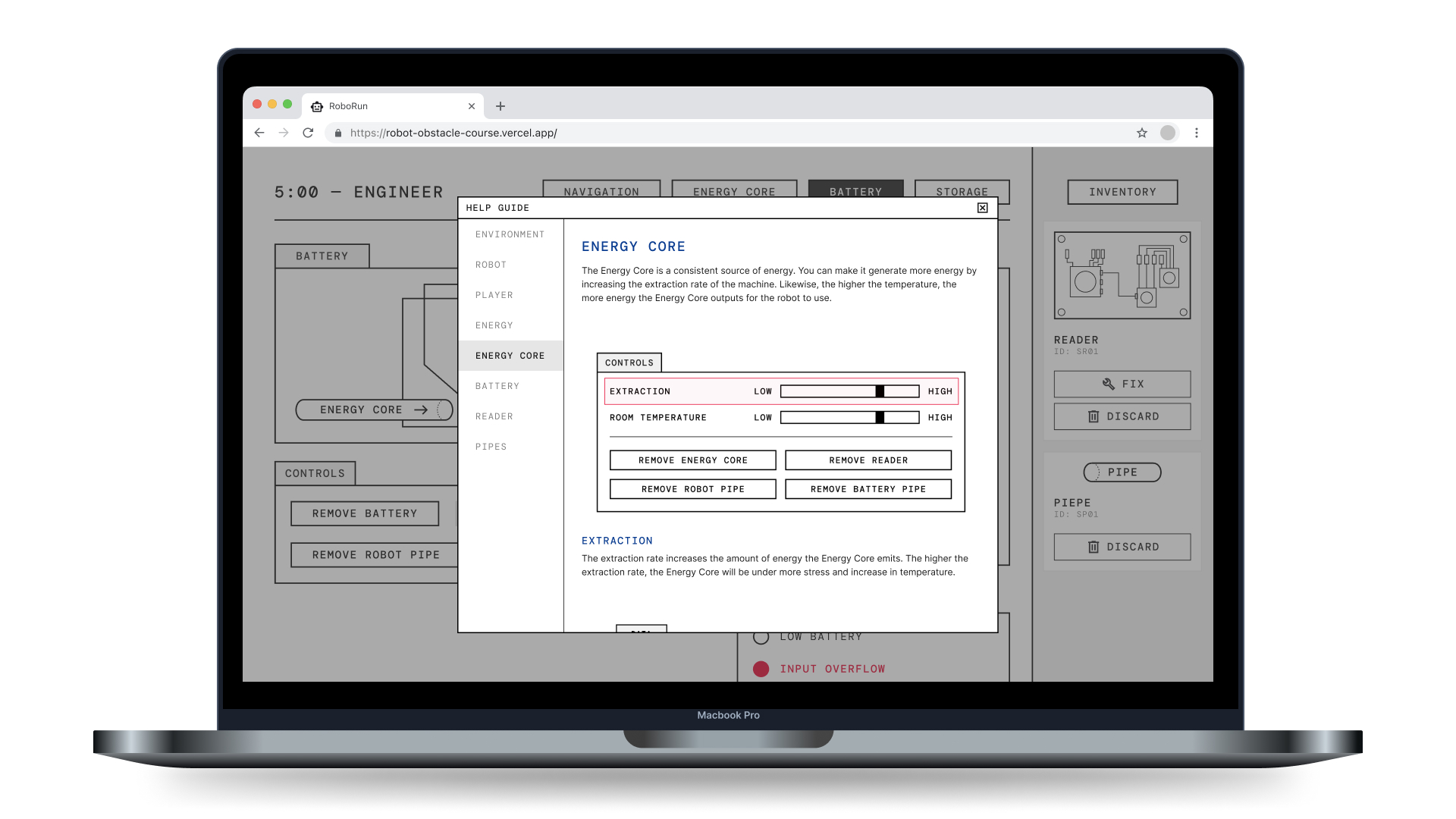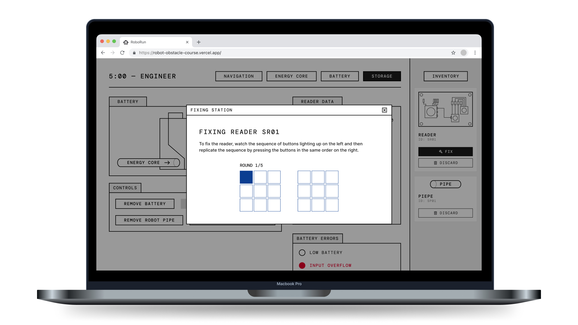 Robo Run is a digital task where players have to navigate a robot through an obstacle course to reach the end goal, but they must also perform maintenance by fixing or replacing faculty components.